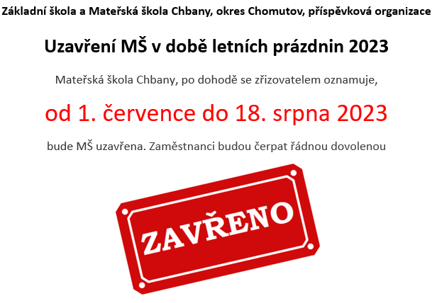 Úvod > Aktuality > Uzavření MŠ v době letních prázdnin 2023