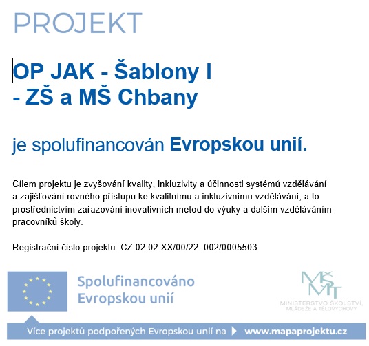 Úvod > Základní škola > Projekty a dotace > Projekt "OP JAK - šablony I - ZŠ a MŠ Chbany"